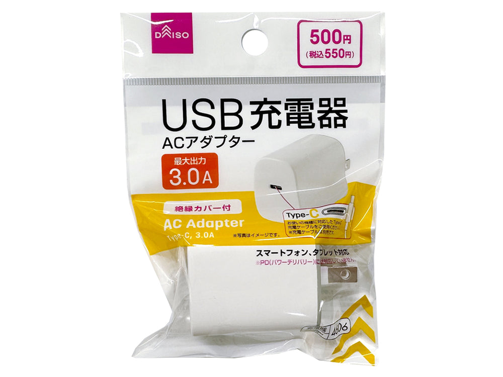 ダイソーでは100円以外のラインとして、500円USB‑ACアダプタ(3A出力)やType‑Cケーブル付属モデルを展開。